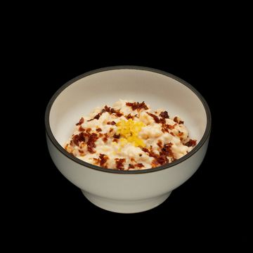 Charred eggplant purée, potato crisps, nira, mushrooms, sake-ponzu butter, truffle oil