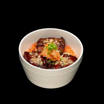 Garlic & soy sauce-marinated salmon, miso eggplant, cucumber, spinach, midori furikake, sushi rice