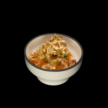 Tenkasu, togarashi, gochujang mayo, chili oil, ebiko, negi, sesame seeds